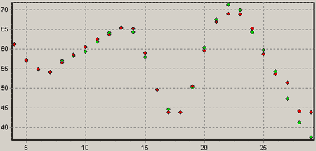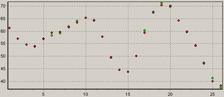 Пояснение к рисунку: зелеными точками отображаются реальные показатели, красными – выход сети.