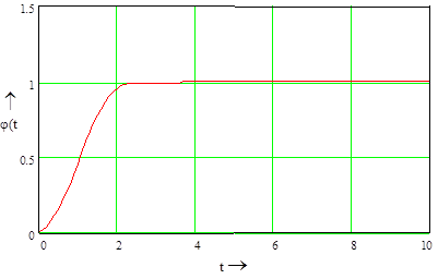 то подставляя выражения (5.15) и (5.16) в выражение (5.17) найдем, чтоj(¥)=1, а m(¥)=0,4. Так как Dx(¥)=1, а j(0- )=0 иm(0- )=0, то коэффициент усиления по каналу задание – выходная величина равен 1, а по каналу задание – управляющие воздействие равен 0,4.