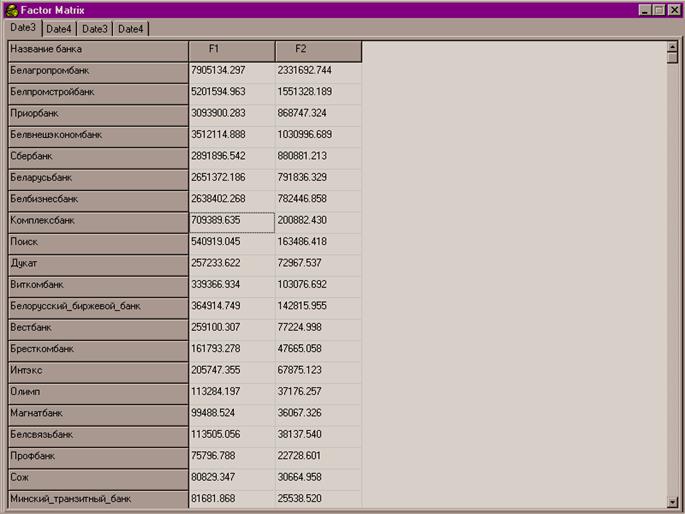 3. По нажатию соответствующей кнопки на панели управления программой, будут построены и отображены матрицы факторного отображения (см приложение 4) ,за каждый из периодов времени. Данные матрицы образуются из факторных матриц, описывающих вклад каждого из показателей в общий фактор (см. приложение 3)