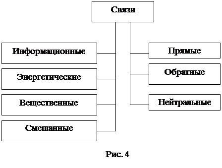 Структура реализуется при помощи связей. Связями называются подсистемы (элементы), осуществляющие непосредственное взаимодействие между другими подсистемами (элементами) и не принимающие решений. Связи переносят компоненты метаболизма из одной пространственной области в другую. При этом возможны некоторые преобразования этих компонент. Связи подразделяются на прямые и обратные.