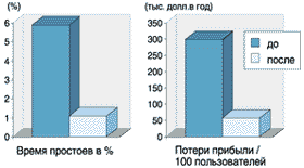 Недоступность приложений, обеспечивающих ведение бизнеса компании, может повлиять как на продуктивность отдельных пользователей, так и на прибыль компании в целом. Мы уже отмечали, что если в обязанности служащего входят те или иные задачи, связанные с использованием сетевой среды, например, системы удаленных заказов или любая работа, которая выполняется совместно с другими специалистами, то простои сетевой инфраструктуры выливаются в простои служащих компании - в значительное снижение их личной продуктивности, а значит, и общей продуктивности решения повседневных задач. Но это только одна сторона медали. Если работа пользователя связана с получением реальной прибыли, то в этом случае недоступность бизнес-приложений - это уже настоящая драма для компании. Например, организации, которые занимаются финансовыми операциями, в этом случе не могут выполненять свои транзакции, то есть теряют реальные деньги. По данным IDC, в опрашиваемых компаниях до инсталляции Unicenter время простоев составляло в среднем 6%. Использование интегрированной управляющей среды позволило сократить непродуктивное время до 1% и снизить потери прибыли из-за невозможности решать текущие задачи бизнеса в среднем на 248 тыс. долл. на 100 пользователей ежегодно за пятилетний период (рис. 3).