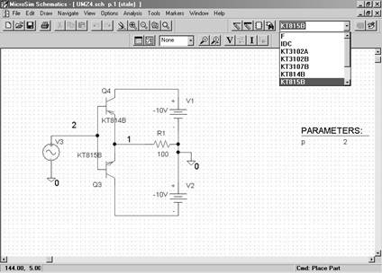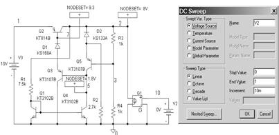 Далее приступают к моделированию. Задав вариацию напряжения источника V1, убеждаются в работоспособности СН, проверив его статический режим при начальных условиях, затем приступают к построению графиков в программе Probe.