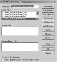 Подключение текстовых библиотек компонентов с расширением.lib выполняется по команде Analysis/LibraryandincludeFiles –открывается меню, приведённое на рисунке 3б. Дальнейший порядок действия аналогичен подключению библиотек символов.