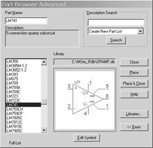Символы компонентов наносятся на схему по команде Draw/GetNewPart (или вызывается также щелчком по пиктограмме). После этого выбирается компонент для размещения на схеме. (Для ускоренного поиска компонента в строке PartName можно написать его имя.) Размещается компонент на чертеже нажатием кнопки Place или Place & Close. Последовательным нажатием левой кнопки мыши можно разместить необходимое количество компо-нентов на чертеже, после нажатия правой кнопки мыши компонент «отвязывается» от курсора мыши. Последние десять символов компонентов сохраняются в оперативном списке, из которого они быстро извлекаются нажатием на стрелку в правой части панели.