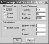 В разделе ACSweepType определяют характер изменения частоты: Linear – линейная шкала; Octave – изменение частоты октавами; Decade – изменение частоты декадами.