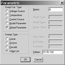 Приведём пример проведения многовариантного анализа по глобальному параметру А. Диалоговое окно вариации параметров имеет такое же назначение полей, как и для директивы DCSweep (рис. 10).