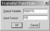 При работе с управляющей оболочкой Schematics определение передаточных функций задаётся в диалоговом окне, открывающемся после нажатия на кнопку TransferFunction в меню выбора директив моделирования (рис. 12). В нём указываются имена входной и выходной переменной.