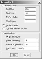 Переходные процессы всегда рассчитываются с момента времени t = 0 до момента <конечное время>, заданного в режиме Transient. Если анализ схем, в которых используются внешние сигналы, обычно не представляет трудностей, то исследование генераторных схем не всегда завершается успешно.