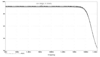 Обратите внимание на то, что характеристики построены в логарифмическом масштабе. В этом случае выражение DB(V(out)) означает, что на экран выведен график АЧХ усилителя (кривая, отмеченная знаком), охваченного ООС АЗ = 20lg[V(out)/V(in+)], поскольку напряжение V(in+) = 1 В. На этой же оси построен график ЛАЧХ усилителя без обратной связи (кривая, отмеченная знаком ◊), который представляет собой следующее математическое выражение: