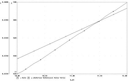 Независимый источник напряжения V2 включён между узлами 10 и 0, начальное значение напряжения которого – 0 В. В процессе выполнения анализа его напряжение меняется от 0 до 1 В с шагом 10 мВ (рис. 36б); таким образом осуществляется управление током зависимого источника тока G1. Ток зависимого источника есть функция напряжения в узле 2 (выход СН) и управляющего напряжения источника напряжения V1. С помощью масштабного коэффициента (0,0125) выбирается абсолютное значение тока зависимого источника тока G1. Например, если V(2) = 8,5 В, максимальное напряжение источника V2 составляет 1 В, максимальный ток на выходе G1 составит 106 мА.