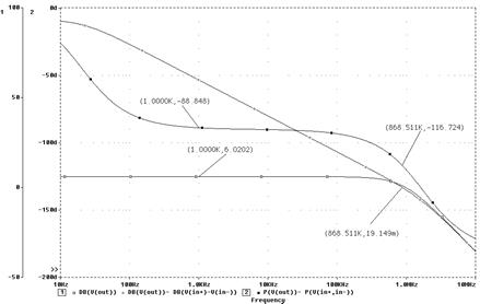 На другой оси построена фазовая характеристика разомкнутого усилителя как разность фаз между фазами выходного напряжения и разностью входных (кривая ■). Если бы была указана трасса P(V(out), был бы построен график фазовой характеристики замкнутого усилителя по отношению к генератору напряжения входного сигнала V3!