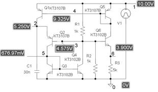Сначала рассчитываем режим генератора по постоянному току в соответствии с заданием, предварительно определив параметры элементов для частоты колебаний 6–10 кГц и амплитуды пилообразного напряжения 5 В (ток коллектора транзистора Q1 выберем около 1 мА).