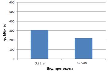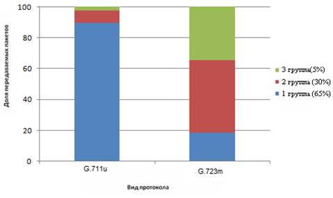 Из графика видно, что для передачи информации одного объема, необходима различная полоса пропускания, в данном случае при использовании кодека G.711uс длиной пакета 160 бит необходима большая полоса пропускания, чем при использовании кодека G.723mс длиной пакета 15.7 бит.