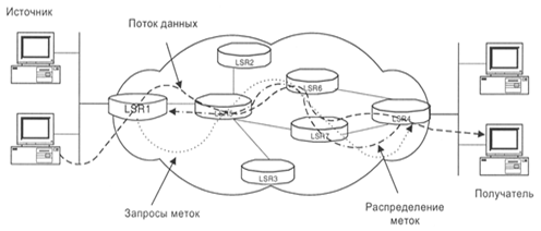 Принцип коммутации MPLS основывается на обмене меток. Любой передаваемый пакет ассоциируется с тем или иным классом сетевого уровня FEC (ForwardingEquivalenceClass), каждый из которых идентифицируется определенной меткой. Значение метки уникально лишь для участка пути между соседними узлами сети MPLS, которые называются также маршрутизаторами, коммутирующими по меткам LSR (LabelSwitchingRouter). На рисунке 1 пограничный маршрутизатор LSR1 - входной, а LSR4 - выходной маршрутизатор. Последовательность маршрутизаторов (LSR1,., LSR4), через которые проходят пакеты, принадлежащие одному FEC, образует виртуальный тракт LSP, коммутируемый по меткам, LSP (LabelSwitchingPath). Таким образом, главная особенность MPLS - отделение процесса коммутации пакета от анализа IР - адресов в его заголовке, что открывает ряд возможностей.