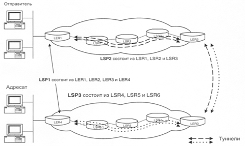 Операции добавления/изъятия метки определены как операции на стеке (push/pop). Результат коммутации задает лишь верхняя метка стека, нижние же передаются прозрачно до операции изъятия верхней. Такой подход позволяет создавать иерархию потоков в сети MPLS и организовывать туннельные передачи. Речь идет о возможности управления в MPLS всем трактом передачи пакета без специфицирования в явном виде промежуточных маршрутизаторов. Это достигается путем создания туннелей через промежуточные маршрутизаторы, которые могут охватывать несколько сетевых сегментов, как это изображено на рисунке 7. Все пограничные маршрутизаторы MPLS (LER1, LER2, LER3 и LER4) используют протокол BGP и создают коммутируемый по меткам тракт LSP между ними (LSP1). LER1 знает о том, что его следующий пункт назначения - LER2, поскольку он передает данные от отправителя, которые должны пройти через два сегмента сети. В свою очередь, LER3 знает о том, что его следующий пункт назначения - LER4, и т.д. Эти пограничные четыре LER будут использовать протокол LDP для получения и хранения меток от выходного LER (LER4 в данном сценарии) вплоть до входного LER (LER1).