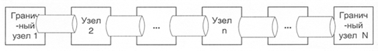 Оцениваемыми параметрами являются: среднее время обслуживания без прерывания (период занятости) и среднее время пребывания пакета в n-м узле. Обслуживаемые за период занятости (т.е. непрерывно, без освобождения) пакеты объединяются в группу на выходе узла и называются пачкой. Средняя длина такой пачки выражается числом пакетов. На вход граничного узла 1 поступает пуассоновский поток сообщений с интенсивностью входного потока заявок