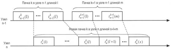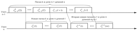 1) и связано с тем, первый пакет k - ой пачки догоняет на этом узле последний пакет (k - l) - ой пачки, и обе пачки - k - я и (k - 1) - я - соответствующим образом сцепляются, как это показано на рисунке 10. Второе явление фрагментации, которое иллюстрирует рисунок 11, не столь очевидно и имеет место только во втором узле, но тоже вполне наглядно. Пусть в первом узле обслуживается пакет номер jиз пачки k и в этот момент на тот же первый узел поступает следующий пакет номер j + 1, время обслуживания которого превышает время обслуживания пакета j. Пусть на следующем втором узле в этот момент нет очереди, и пакет jобслуживается, как только он поступает на узел 2, пакеты j + 1 и j начинают обслуживаться одновременно на узлах 1 и 2, соответственно. Когда пакет jзатем покидает узел 2, пакет j+1 всё ещё продолжает обрабатываться на узле 1, поскольку время его обслуживания дольше.