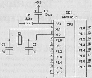 Элементы R1, С1 составляют цепь начального сброса микроконтроллера. Она служит для перевода в исходное состояние всех внутренних систем микроконтроллера сразу после включения питания. Кварцевый резонатор Z1 определяет частоту встроенного тактового генератора микроконтроллера. Этот генератор предназначен для синхронизации всех внутренних процессов микроконтроллера. Микросхема АТ89С2051 допускает выбирать частоту кварцевого резонатора до 24 МГц. Нижний предел частоты не ограничивается. Конденсаторы С2 и СЗ - это согласующие элементы для кварца. Микроконтроллер АТ89С2051 допускает применение в качестве времязадающей цепи резонансного контура, и даже подключение внешнего тактового генератора. Оставшиеся выводы микроконтроллера представляют собой два порта ввода/вывода, которые обозначены Р1 и РЗ. Именно к этим двум портам и подключаются периферийные устройства.