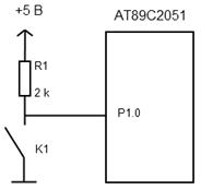 На вход микроконтроллера через резистор R1 подается напряжение от источника питания +5 В. Микросхема воспринимает это напряжение как сигнал логической единицы. При срабатывании датчика контакты замыкаются и соединяют вывод микроконтроллера с общим проводом. В результате напряжение на входе Р1.0 падает до нуля. В следствии микросхема воспринимает входной уровень сигнала как логический ноль. Резистор R1 при этом служит токоограничивающим элементом, предотвращая короткое замыкание между шиной питания и общим проводом.