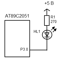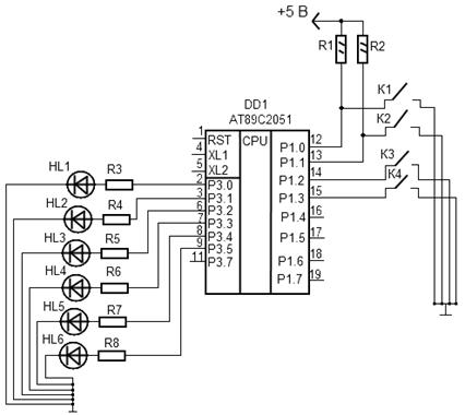 Как видно из схемы порт Р1 работает как порт ввода. Шесть младших P3 работают на вывод. Возможен и обратный вариант (Р1 на вывод, Р3 на ввод).