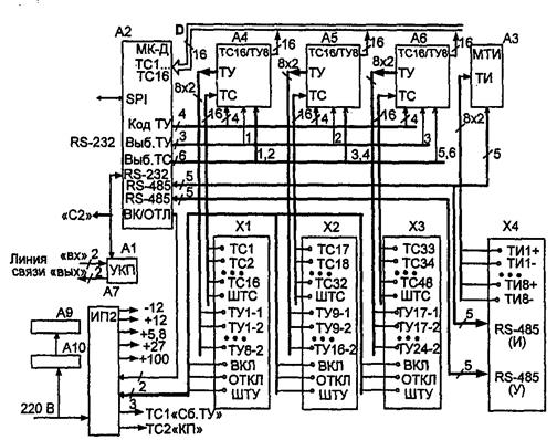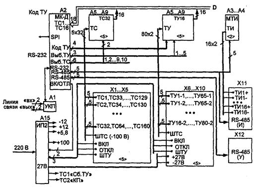 Выходы команд телеуправления ТУ1. ТУ80 (от мультиплексоров ТУ 1 б), входы каналов телесигнализации ТС 1. ТС 160 (от мультиплексоров ТС32) и телеизмерений ТИ1. ТИ16 (от мультиплексоров ТИ) выведены на наборы соединительных зажимов X1. X11.
