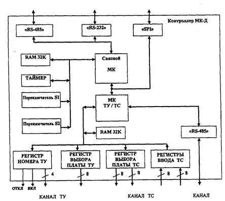 Контроллер МК-Д. Структурная схема контроллера МК-Д приведена на рис. 20. В состав контроллера МК-Д входят два микропроцессора: связной МК, поддерживающий обмен с компьютером внешнего уровня, и МК ТУ/ТС, предназначенный для формирования сигналов ТУ, ТС и ТИ. Связь между этими микропроцессорами осуществляется по интерфейсу SPI. Для хранения и обработки данных имеется оперативная память, таймер обеспечивает данные временными метками. Переключатели позволяют устанавливать режимы работы контроллера МК-Д и его адрес для работы в системе телеуправления. Подробнее работа контроллера будет описана ниже.