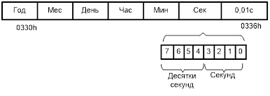 Таймер. Таймер установлен в контроллере для получения значений текущих времени и даты, которыми маркируются сообщения ТС и ТИ. Один раз в секунду данные из микросхемы таймера переписываются в буфер времени и даты МК ТУ/ТС. Значения в буфере хранятся в двоично-десятичной системе исчисления, формат данных представлен на рис.12.