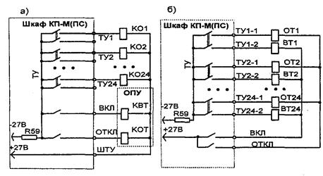 При двухрелейной схеме подключения объектов телеуправления (см. рис.13,6)используются цепи выбора объектов телеуправления ТУ1-1. ТУ24-1 и ТУ1-2. ТУ24-2, командные цепи телеуправления ВКЛ и ОТКЛ. При этом цепи ВКЛ и ОТКЛ запитаны от положительного полюса источника электропитания напряжением 27 В модуля ИП2.