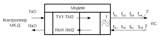 Модем предназначен для организации связи по четырехпроводным некоммутируемым каналам тональной частоты и физическим линиям связи между контроллером МК-Д находящимся на КП, и ЭВМ на пункте управления. Модем обеспечивает работу в одном из двух форматов: по системе ЛИСНА или по протоколу Modbus (АСТМУ-А). Во всех форматах диапазон рабочих частот в канале связи от 300 до 3600 Гц. Используется частотная модуляция сигнала с двумя частотами Fh (нижняя частота) и Fb (верхняя частота). Модем осуществляет преобразование двоичных сигналов контроллера МК-Д в аналоговые сигналы линии связи и наоборот (рис. 19).