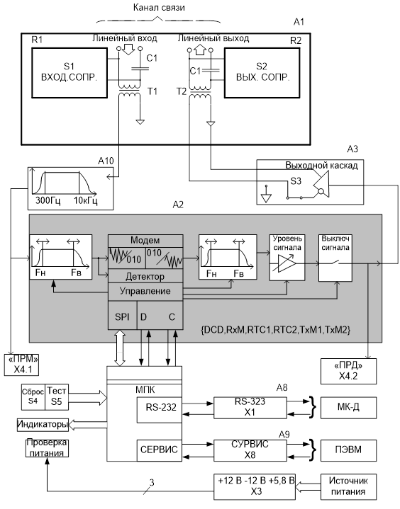 Функциональная схема модема представлена на рис. 20. В состав платы модема-УКП входят: согласующие линейные цепи А1, модулятор-демодулятор (модем) А2, линейный выходной каскад A3, микропроцессорный контроллер (МПК) А4, переключатели задания режимов работы модуля А5, индикаторы состояний работы МПК А6, схема контроля напряжений электропитания А7, интерфейс RS-232 A8, интерфейс СЕРВИС А9, предварительный полосовой фильтр А10.