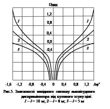 До ФД амплітудного дискримінатора не висуваються жорсткі вимоги до точності визначення різниці фаз цих сигналів. Від нього потрібно лише визначення знака цієї різниці, тобто +90 або -90° , оскільки у точці, що відповідає максимуму ДН сумарного променя антени, відбувається зміна фази сигналу різницевого каналу на 180° (див. рис. 2). На виході ФД відповідно утвориться позитивна або негативна напруга «Знак», що разом із вихідною напругою дискримінатора (U вИх ) подаються до обчислювального пристрою.