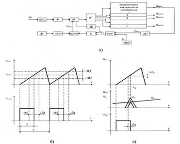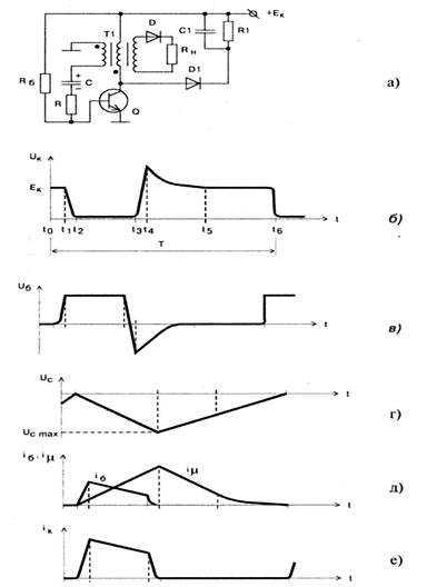 Рис.1. Автоколебательный блокинг-генератор а) принципиальная схема б)... е) временные диаграммы