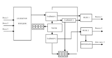 Основу прибора составляют часы реального времени и два логических устройства (ЛУ), которые формируют заданные временные интервалы. Информация о совпадении заданного интервала с текущим временем поступает на силовое реле один или два, в зависимости от номера канала. Существует возможность управлять режимами работы ЛУ внешними сигналами подаваемыми на блок коммутатора на вход 1 или вход 2. Контролировать текущее состояние прибора и осуществлять его настройку можно через Четырехразрядный семисигментный индикатор.