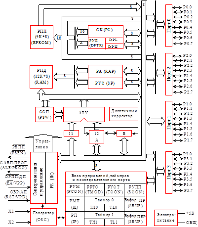 Основу структурной схемы микроконтроллера (рисунок 1) образует внутренняя двунаправленная 8-битная шина, которая связывает между собой все основные узлы и устройства: резидентную память, АЛУ, блок регистров специальных функций, устройство управления и порты ввода / вывода.
