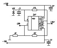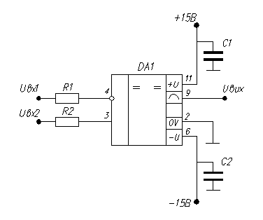 Резистор R1 і послідовне з'єднання резисторів R2 i R3 виконують роль симетруючих вхідний струм мікросхеми. Крім того нижній симетруючий резистор розбитий на дві частини (R2 , R3 ). Резистор R3 виконує роль захисного. При перевищенні на вході схеми значення U0n (більше +15 В, або менше -15 В) надлишкова напруга, що перебільшує значення ±15 В впаде на резисторі R3 , пропускаючи струм в джерело живлення ±15 В через діоди VD1 або VD2.