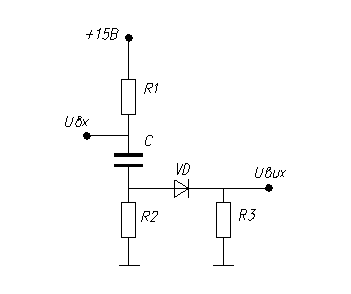 Для запуску одновібратора використовуємо диференцюючу ланку на основі R-С елементів (рис. 10). Враховуючи, що в наступній схемі будемо використовувати мікросхему на операційному підсилювачі К140УД7 з вхідною диференціальною напругою не перевищуючою ±12 В, R-С ланку виконаємо з двох резисторів, створюючи з них також дільник напруги. Встановимо параметри для дільника Uвих = 5 В, Е = І5 В. Задаємось резистором R1 = 12 кОм. Тоді вихідна напруга буде залежати ще й від двох резисторів дільника R2 і R3 – вхідного опору наступної схеми.