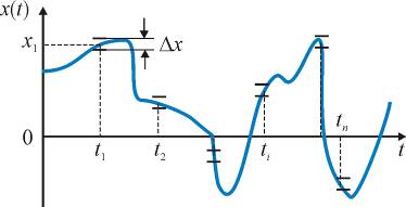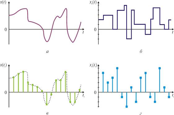 По виду областей существования и значений случайной функции СП делятся на непрерывные (непрерывные области существования и значений – рис. 30а), дискретные (непрерывное множество значений аргумента и дискретное множество значений – рис. 30б), непрерывные случайные последовательности (дискретная область существования и непрерывная область значений – рис. 30в) и дискретные случайные последовательности (дискретная функция дискретного аргумента – рис. 30г).