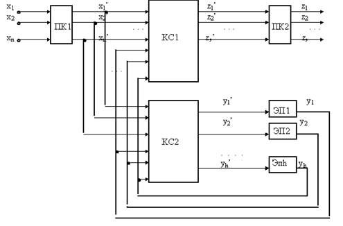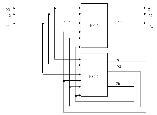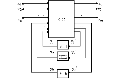 Рассматриваемая схема состоит из двух частей: комбинационной схемы (КС) и набора элементов памяти (ЭП). Переменные y1 , y2 ,…, yh , соответствующие выходным сигналам элементов памяти, называют внутренними переменными автомата. Переменные y1 ', y2 ',…, yh ' используются в схеме для обозначения входных сигналов, изменяющих состояние элементов памяти, и называют функциями возбуждения . В качестве элементов памяти на практике чаще всего используют элементарные автоматы.