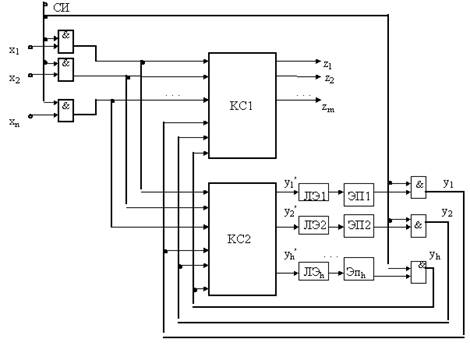 Необходимо отметить, что вид структурной схемы автомата в сильной степени зависит от используемой системы логических элементов. Например, при построении схемы на элементах с синхронизацией, сохраняющих результат логической операции до момента прихода считывающего сигнала, необходимость в элементах памяти часто отпадает. В этом случае структурная схема автомата может быть изображена в виде, приведенном на рисунке 2.3.1.