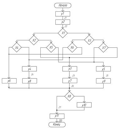 Далее разметим алгоритм с учётом входных, выходных сигналов и состояний для построения абстрактного автомата Мили: