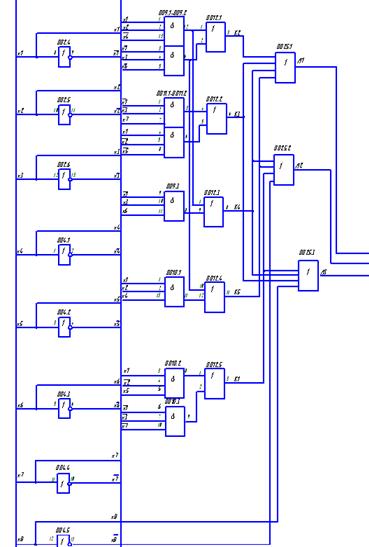 Осуществлена реализация схемы управляющего автомата на микросхемах ТТЛ серии К555 обладающих высоким быстродействием и малым потреблением.