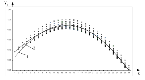 Исходная последовательность представляет собой реализацию нестационарного случайного сигнала, математическое ожидание которого является функционально зависимым. Сложность обработки таких реализаций заключается в отсутствии априорных данных о функциональной зависимости математического ожидания [5]. Априорно неизвестна функциональная зависимость полезного сигнала