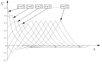 Рис. 13. Семейство импульсных характеристик дискретной системы, реализующей метод кусочного размножения при получении оценки полезного сигнала на начальном интервале значений