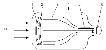 РЭОП представляет собой крупногабаритный электровакуумный прибор с остаточным давлением 1 – 5×10-7 мм рт. ст. Внутри колбы находятся фотокатодный узел, состоящий из входного флуоресцентного экрана 1 и фотокатода 2, система электродов 3,4,5 и выходной люминесцентный экран 6. Флуоресцентный слой ( CaWO4 или CsI) и слой фотокатода (Cs) нанесены с двух сторон тонкой стеклянной пластины толщиной 200 мкм. Световые фотоны, излучаемые под действием рентгеновского излучения, выбивают из фотокатода электроны, которые ускоряются и фокусируются системой электродов. Электрод 1 (подфокусирующий) представляет собой слой аммония, напыляемый на внутреннюю поверхность колбы. Энергия электронного потока, выходящего из фотокатода, увеличивается за счет прилагаемых к электродам высоких напряжений. Одновременно увеличивается плотность электронов за счет сжатия электростатическими линзами. Электроны бомбардируют выходной экран 6, представляющий собой мелкозернистый люминограф, напыленный на внутреннюю сторону окна колбы. Диаметр входного окна современных РЭОПов составляет 220 – 350 мм. Начинается выпуск РЭОПов с диаметром входного окна до 550 мм.