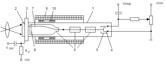Вторым функциональным узлом видикона является электронный прожектор, включающий в себя подогревный катод 4, модулятор 5 и аноды 6. Он обеспечивает ускорение и формирование узкого пучка электронов. Непосредственно у сигнальной пластины расположена мелкоструктурная сетка 8, которая создает равномерное тормозящее поле перед мишенью. Благодаря этому электроны падают перпендикулярно на фотослой по всей его площади. Фокусировку и отклонение электронного луча 7 обеспечивает магнитная фокусирующе-отклоняющая система. Для фокусировки электронного луча используется соленоид 9. Пролетающие сквозь него электроны группируются (закручиваются по спирали) вблизи его оси. Отклонение луча производится парами отклоняющих катушек 10 – горизонтальной (строчной) и вертикальной (кадровой).