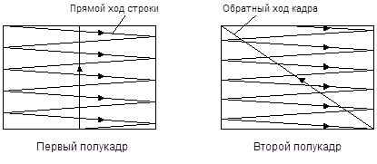 Как правило, видеоконтрольные устройства (ВКУ), предназначенные для РТС, работают со стандартными телевизионными сигналами. Изображение на ВКУ формируется с помощью кадровой и строчной развертки, причем один кадр состоит из двух полукадров, или полей, с частотой 50 Гц. При этом строки в полукадрах чередуются – чересстрочнная развертка (рис.4).