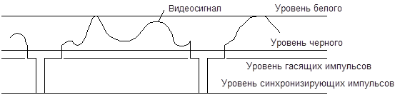 Все эти импульсы вместе с видеосигналом объединяются в так называемый полный телевизионный сигнал (ПТС). Форма ПТС показана на рис.5. На нем изображены только строчные синхронизирующие и гасящие импульсы. Соответствующие кадровые импульсы намного длиннее и, кроме того, кадровый синхроимпульс представляет собой сигнал сложной формы. Полный телевизионный сигнал генерируется в видеоканале.