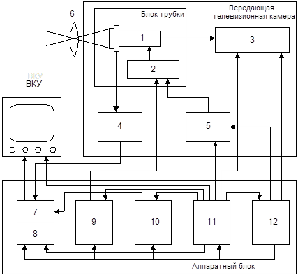 Выходной сигнал предварительного усилителя поступает в аппаратный блок на вход усилителя канала 7. Он осуществляет дополнительное усиление и замешивание в видеосигнал гасящих и синхронизирующих импульсов, формируя полный телевизионный сигнал. В него входит также g-корректор 8, который обеспечивает различные формы амплитудной характеристики. В аппаратном блоке имеются также генератор кадровой развертки 9, генератор компенсирующих сигналов специальной формы 10 для компенсации специфических искажений, обусловленных особенностями трубки.