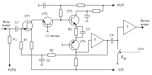Восстановление среднего значения видеосигнала (т.е. возвращение ему характера униполярности) происходит на входе третьего каскада. Это делается с помощью ключа Sф , управляемого строчными синхроимпульсами. Вначале каждой строки он кратковременно замыкается и разряжает постоянную составляющую напряжения конденсатора С4. Благодаря этому видеоимпульсы на входе третьего каскада начинаются с нуля. Это называется фиксацией уровня черного. Постоянная времени в цепи конденсатора С4 выбирается намного больше длительности строки, чтобы за это время он не успел заметно зарядиться.