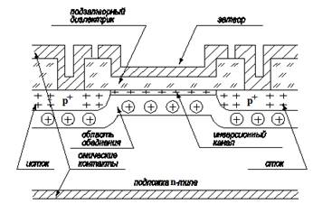 Полевые транзисторы в активном режиме могут работать только в области слабой или сильной инверсии, т.е. в том случае, когда инверсионный канал между истоком и стоком отделен от объема подложки слоем обеднения. На рисунке 1 приведена топология МДП - транзистора, где этот факт наглядно виден.